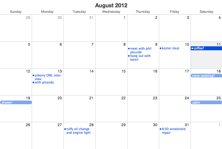 So now you know two things I've done in my ten days home. In addition to clothes-shopping and State-Fairing, I've also gone up to visit relatives in Northeast Iowa and taken a couple trips to Des Moines. I've been looking for jobs and will hopefully have something to report on that front soon.